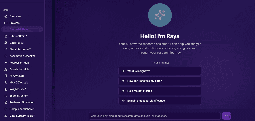 Whether you're running statistical tests or coding qualitative data, Insightra delivers fast, accurate, and explainable results — without writing a line of code.