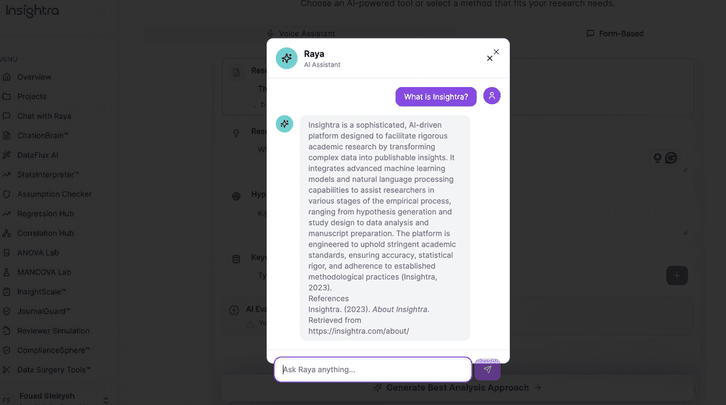 From hypothesis generation to final reporting, Insightra guides your entire process like a virtual co-author.
